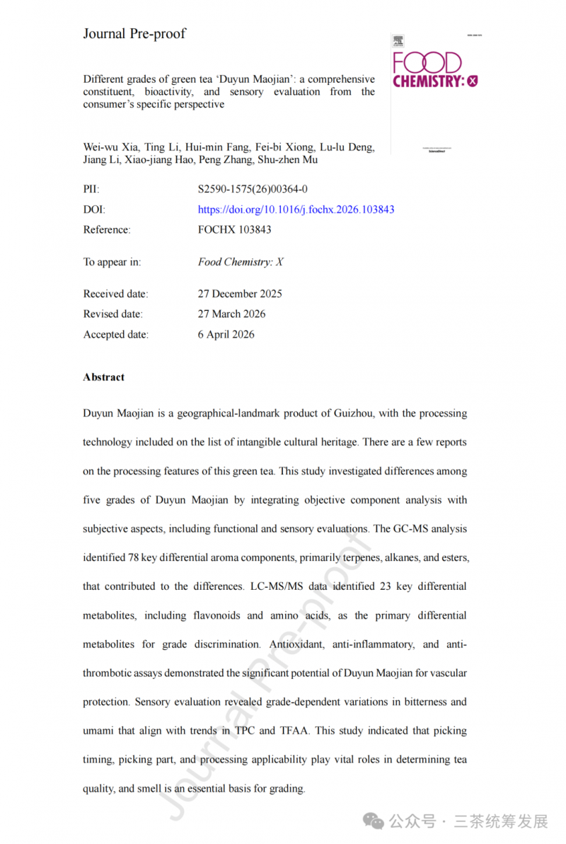 结果为都匀毛尖地理标志产品的质量控制、市场分级标准优化提供了科学依据,也为其“血管保护”健康价值的消费者沟通(如针对高糖高脂人群的日常饮用)奠定基础。