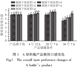 A、B两种原料瓶产品的整体喜好度均受瓶子刚生产下线后放置的天数的影响,放置时间越长,整体喜好度分值越高;