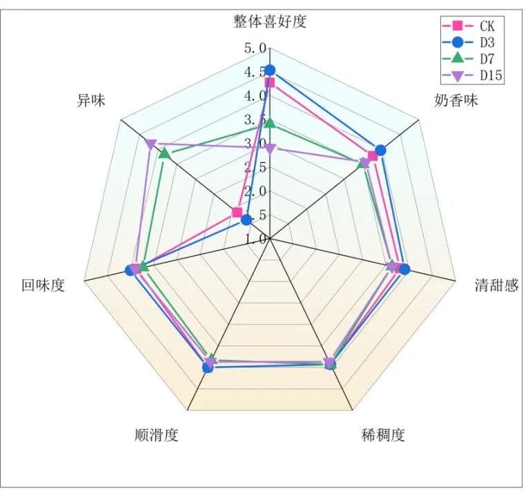 感官品评由30人组成品评小组,用0-7分(0-7表示太淡了一太浓了)评价样品的关键感官特性(奶香味、清甜感、异味、顺滑度、回味度、稀稠度)和整体喜好度(标准:1分:非常不喜欢;2:比较不喜欢;3:有点不喜欢;4:一般/能接受;5:有点喜欢;6:比较喜欢;7:非常喜欢)。03电子舌取30 mL巴氏杀菌乳置于电子舌专用样品瓶中,放至室温,将电子舌传感器活化、设置程序勾选所需检测味道后安装传感器开始测试,用仪器自带软件完成PCA分析。